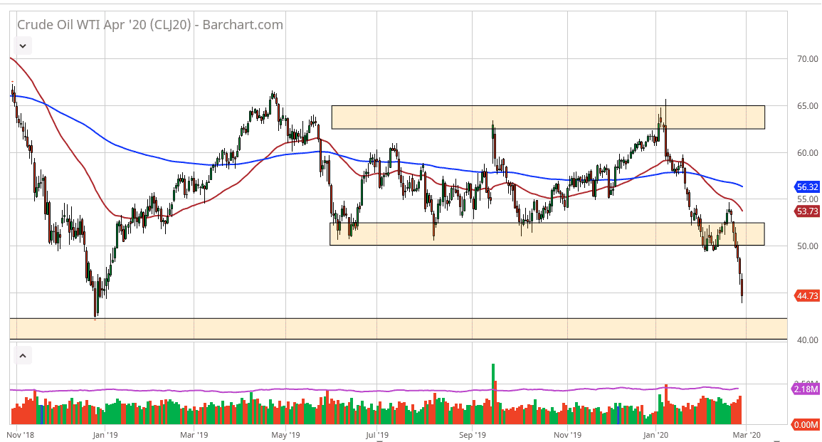 The West Texas Intermediate Crude Oil market broke down below the $45 level during the trading session on Friday, showing signs of weakness yet again. The fact that we have broken down the way we have suggest that we will probably go looking towards the $40 level underneath. This is a market that continues to see lots of the coronavirus fears and therefore people are starting to wonder whether or not there is going to be enough demand. Economies around the world are grinding to a halt, and that of course works against the total demand picture.