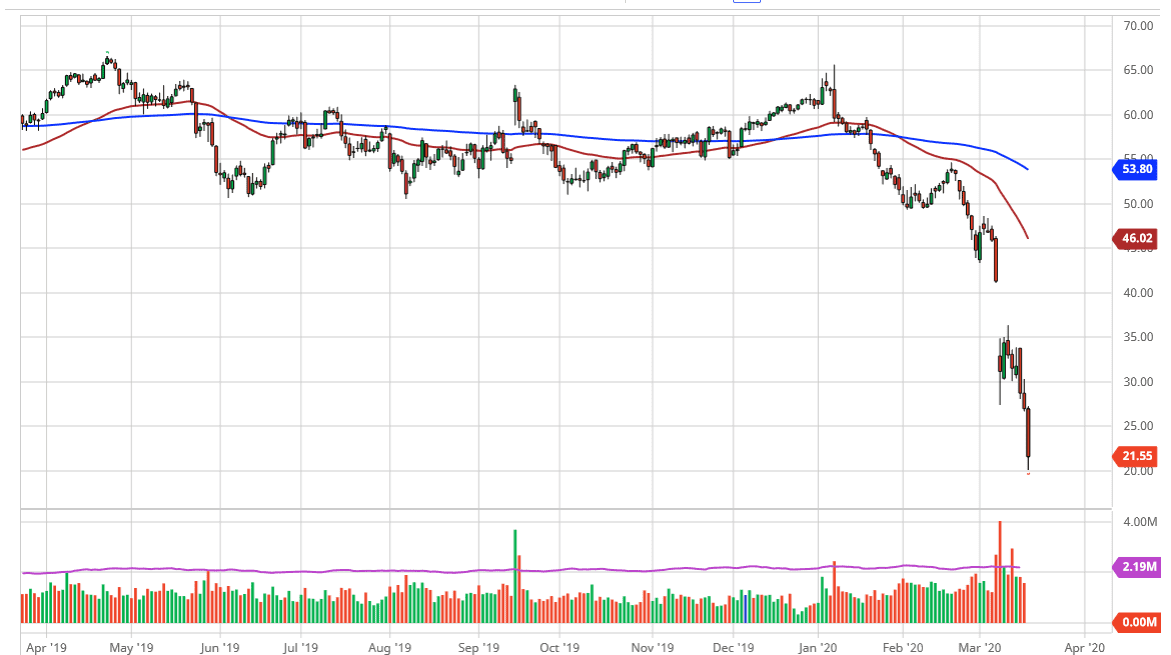 If we can break down below the $20 level, the market will more than likely go looking towards the $17.50 level, possibly even the $15 level. Granted, we are oversold at this point so any bounce will more than likely invite more selling based upon the market be in overextension. All things being equal though, it will be interesting to see how low we can go, and it’s probably going to be based upon the economy and whether or not we can get back to work relatively soon and then of course the whole massive output increase from Saudi Arabia perhaps slows down. That seems to be unlikely so regardless of how quick the economy can bounce back from the coronavirus, there will be a bit of a lid on how far we can go, that may very well end up being the gap above. In the meantime, I like fading those short-term rallies that show signs of exhaustion.