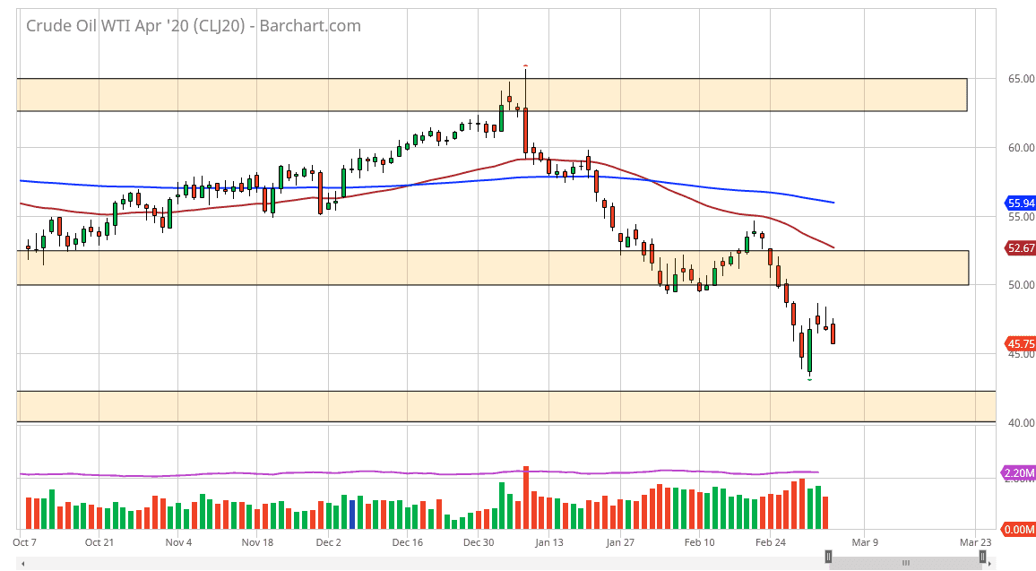 Looking at this chart, it’s obvious that the market still has further to go, with perhaps an eye on the $44 level. The jobs number comes out on Friday and that of course will have a major influence on what happens in the marketplace, as it could give us an idea as to global demand for crude oil. If the jobs number is very loose, that will more than likely show that the economy in the United States is starting to drop, and it would make the idea of demand for crude oil to be all but impossible. However, if we were to break above the 200 hourly EMA then I think we make a charge towards the $50.00 level where we rolled right back over. It’s hard to imagine a scenario where this market can rally for any significant amount of time as demand has clearly shown that it’s lacking.