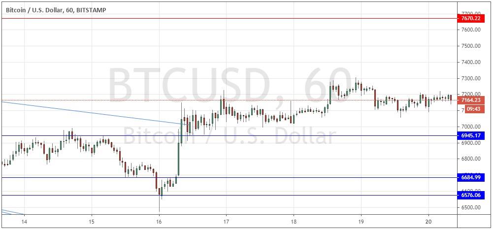 I would be prepared to take a long trade from a bounce at the support level at $6,945 and I would also be bullish if we get two consecutive hourly closes above $7,300 later today. I would not look for any short trade.