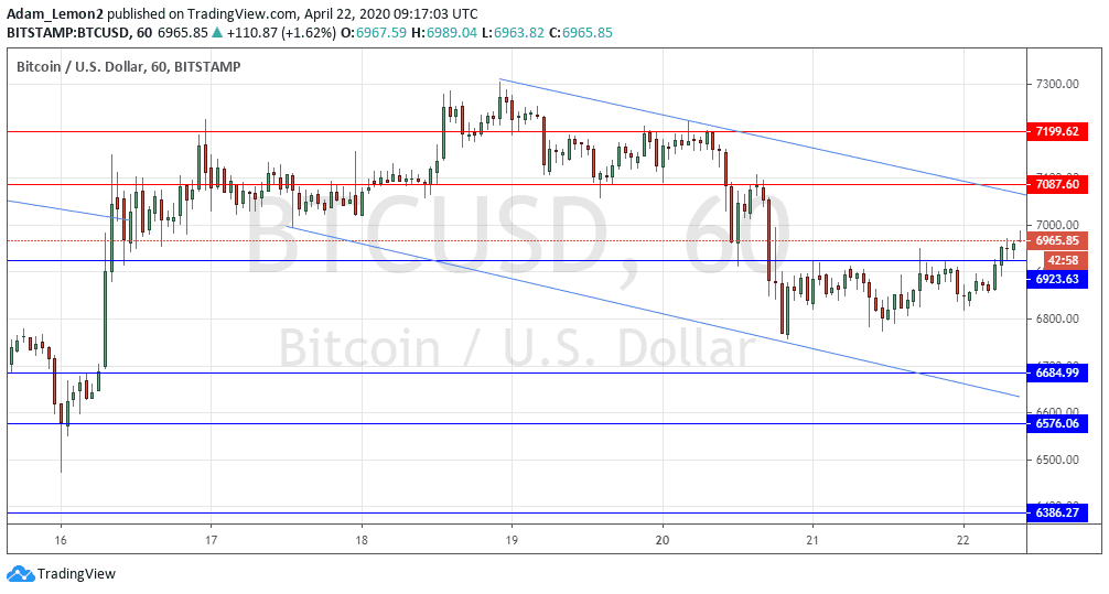 Although this action suggests bullishness, the price chart below still looks bearish because it has become obvious that the price is still within a symmetrical, downwards-sloping price channel. Also, the new support at $6,923 does not look very reliable.