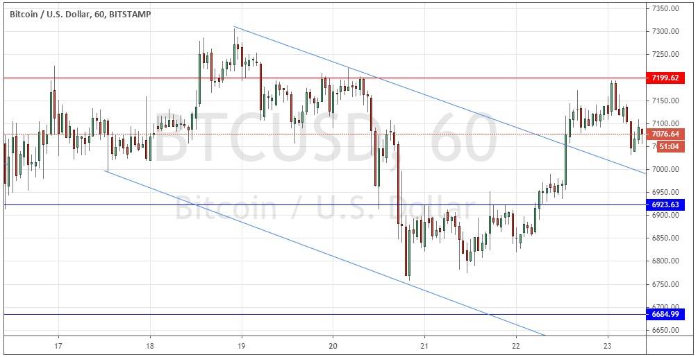 I wrote yesterday that I was looking for the bearish price channel and an obvious horizontal level at $7,088 to hold, so I wanted to take a bearish bias if we got a bearish reversal there. Even if the reversal happened higher than that at $7,200, I was ready to take it.