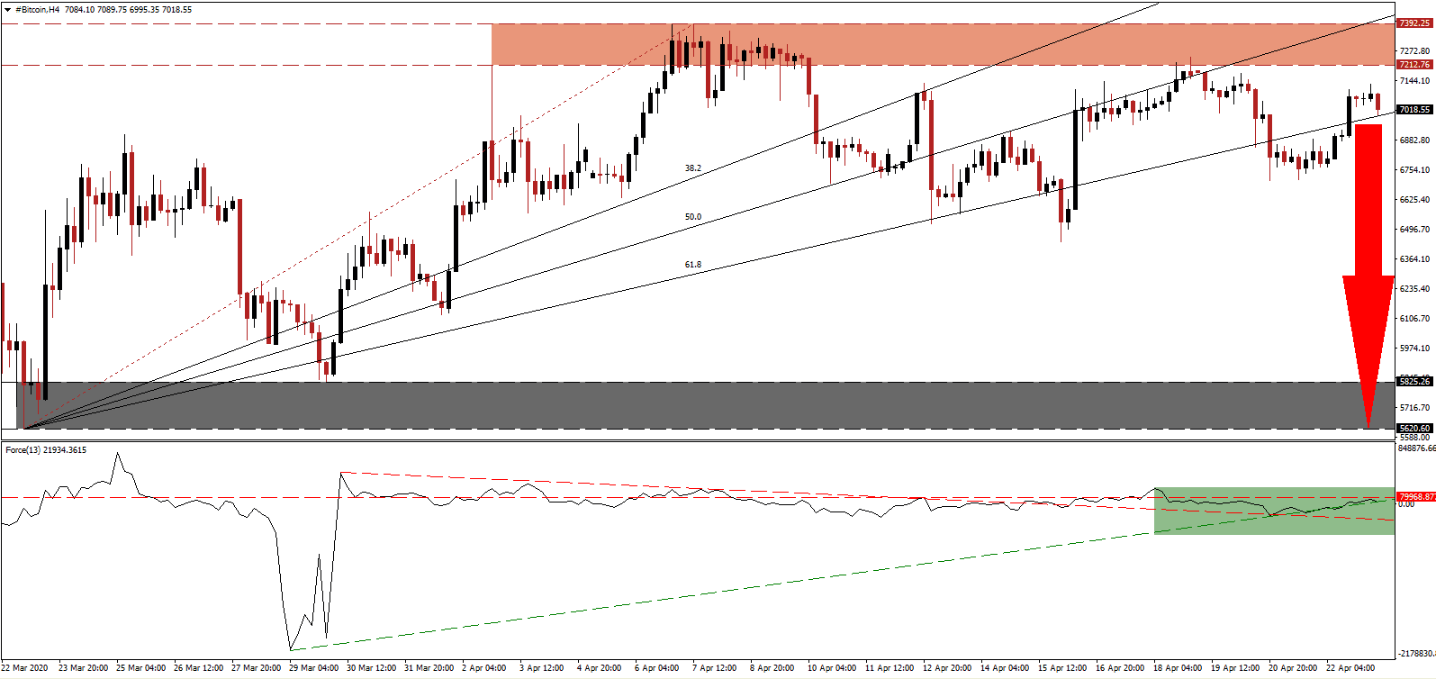 Following the exit of the ascending 38.2 and 50.0 Fibonacci Retracement Fan Resistance Levels above the resistance zone, this cryptocurrency pair came under an additional spike in bearish momentum. This zone, located between 7,212.76 and 7,392.25, as marked by the red rectangle, rejected the BTC/USD on three occasions. It represents a significant obstacle for price action, and in combination with dominant fundamental conditions, a more massive correction phase is anticipated to materialize.