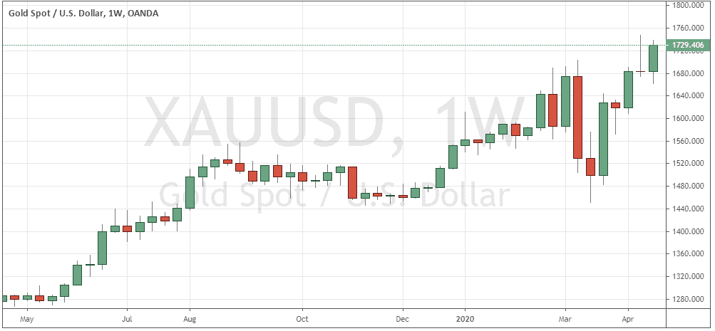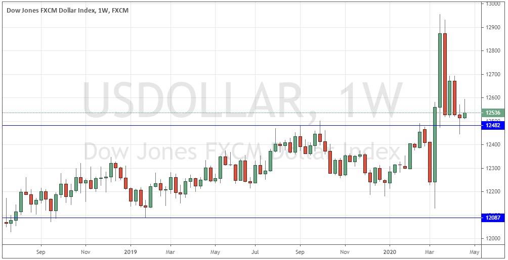 WTI Crude Oil made a bullish pin candlestick last week after making its lowest weekly close in decades the previous week. Oil futures went heavily into negative territory for the first time ever due to a supply glut and a lack of available storage space for the glut. If the global economy does somehow begin to recover, this could be a very long-term low in the price, but action is highly volatile and trading crude oil at present is an extremely risky business. Day traders may find WTI crude oil attractive at present due to the high volatility and just trade the swings on shorter time frames.