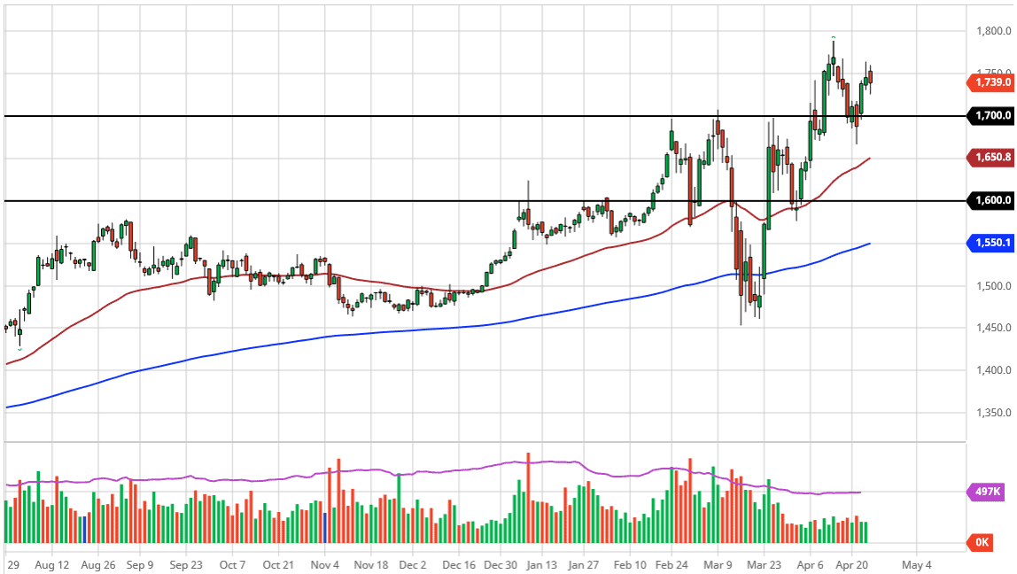 I believe $1700 begins about a $50 support level, and it should be noted that the 50 day EMA is currently at the $1650 level and therefore I think that we will see a lot of support in that area. Alternately, if we break above the top of the shooting star from the Thursday session, we could go towards the highs again, but we need some type of shock to make that happen. As we head into the weekend though, anything is possible so we will have to see whether or not there is a gap higher to kick off the week. I doubt that going into the close, so I am more of the mindset of buying the pullback, but I would be flexible enough to buy this market if it gaps to the upside at the open.