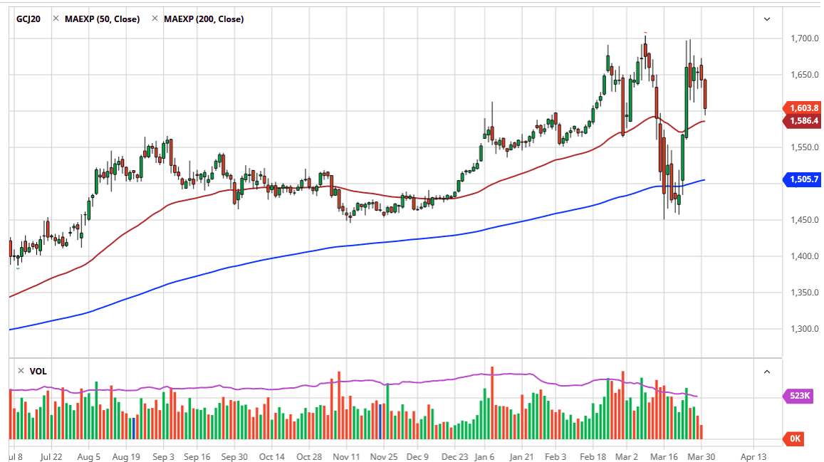 That being said, if we do break down below the 50 day EMA it’s likely that we will first attack the $1550 level, followed by the $1500 level underneath which is basically where the 200 day EMA is. Either way, I don’t have any interest in shorting gold because I believe that it’s only a matter of time before gold rallies due to the global fear that’s out there. Granted, there is no such thing as inflation right now, but the reality is that central banks around the world continue to loosen monetary policy in a whole plethora of ways, and eventually this does cause gold to rise.