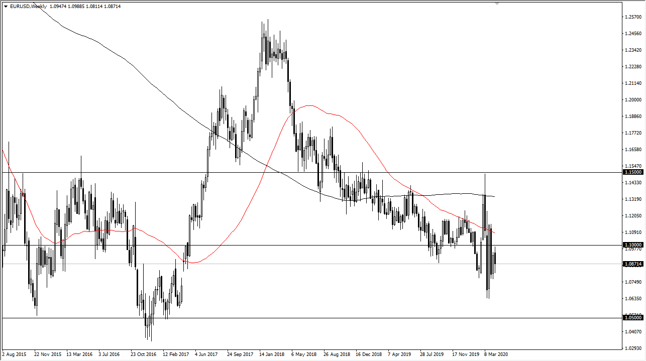 The Euro was all over the place during the week, initially trying to get above the 1.10 level before breaking back down to the bottom of the range for the previous week and then bouncing slightly. Ultimately, we did end up forming a negative candlestick, and it looks to me like the Euro is going to go sideways in general, with the 1.10 level offering a significant amount of resistance. I think the 1.08 level also offers a significant amount of support. Expect a lot of choppiness but overall, I still favor the downside.