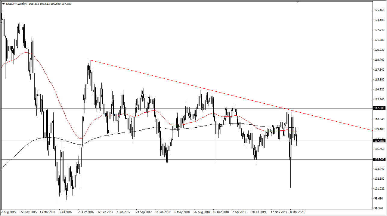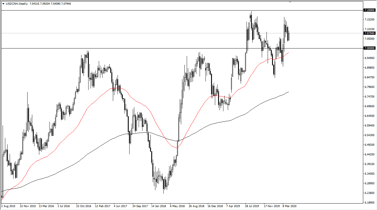 I know a lot of you don’t necessarily trade the Chinese offshore currency, but the reality is that it’s very important to pay attention to what’s going on in this chart. Currently, it looks as if the US dollar continues to climb higher over the longer term, and this of course has major ramifications when it comes to emerging market currencies, as well as risk appetite. While the stock market celebrated in a major “risk on” move during the back half of the week, the reality is the US dollar has flexed its muscles a bit. This tells me that the currency market doesn’t believe the “all clear” narrative.