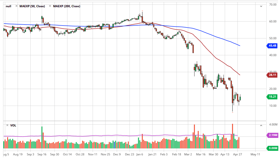 To the downside, the $10 level should offer plenty of support, and I think at this point as we rollover it is likely that the market will probably go looking towards the $10 level for support. At this point, if the market breaks down below there probably goes looking towards the $7.50 level, which is an area that had seen a bit of buying in the past as well. Longer-term, people have to worry about whether or not anybody is going to want to take delivery of crude oil at the end of the month, and that could cause massive problems. We have already seen that with the May contract and there is nothing to suggest that the June contract will do the exact same thing. With that in mind, I like the idea of selling this contract any time it tries to rally as it has no business going higher. Ultimately, I think it is a real question as to whether or not we at the zero dollars level.