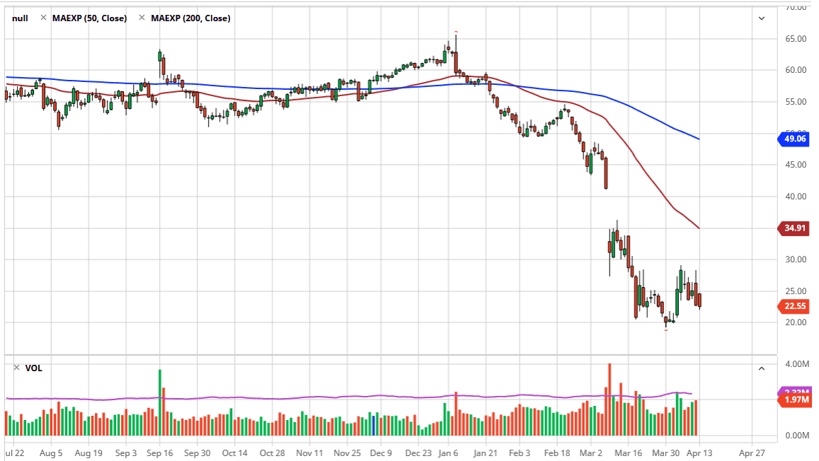 With the coronavirus ripping through the world’s economy, there is a lot less demand for crude oil, which quite frankly had been oversupplied for some time anyway. That being said, it is going to be a process rather than a simple matter of “flipping a switch” in order to put bullish pressure into this market. The best case scenario is probably going to be that the market simply grind back and forth in order to form some type of larger base to turn things around and bounce from an extraordinarily low level. In fact, right now it looks as if the market is trying to use the $20.00 level as the bottom of the range that could extend his high as $30.00 above. The longer the market spends going back and forth between these two levels, the better off it’s going to be for the buyers longer term.