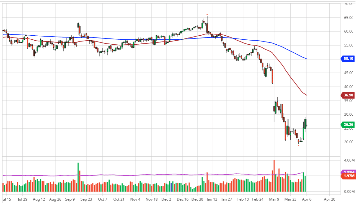Regardless of what OPEC or Russia does, the reality is that demand is still going to be almost 0, so therefore it’s likely that the oil markets will continue to struggle to hang on to gains. At this point, it’s very unlikely that the market can break to significantly to the upside, but at this point I think any time there is a rally it’s likely that we will start to short at the first signs of exhaustion. The gap above could be a target if there was a sudden bullish move, but at this point it’s very unlikely that we get that filled anytime soon. I believe that the $20 level underneath would be a massive support level, so if we were to break down below there the market could completely unravel. In the short term though, I think simply fading short-term rallies is the best way to go going forward as the demand picture for crude oil is going to continue to be very soft going forward. Keep your position size small though, because if you are in the market, sudden headlines could cause major headaches.
