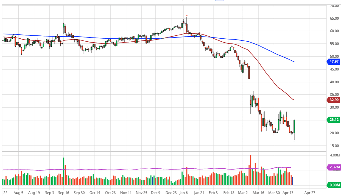 Looking at the chart, I believe that the $20 level underneath is massive support, and therefore I think it’s only a matter of time before we reach towards that level again. On the other hand, if for some reason we break out to the upside, the gap above that sits at the $42 level will more than likely offer a massive ceiling as well. I look for signs of exhaustion after short-term rallies to sell, and I think that this will be one of the better trades for the next several months. That being said, bear market rallies can be brutal so keep that in mind when you put your position on. Don’t over lever, which is a major failing of most retail traders. Murphy’s Law dictates that as soon as you do, the market will be up four dollars in the blink of an eye.