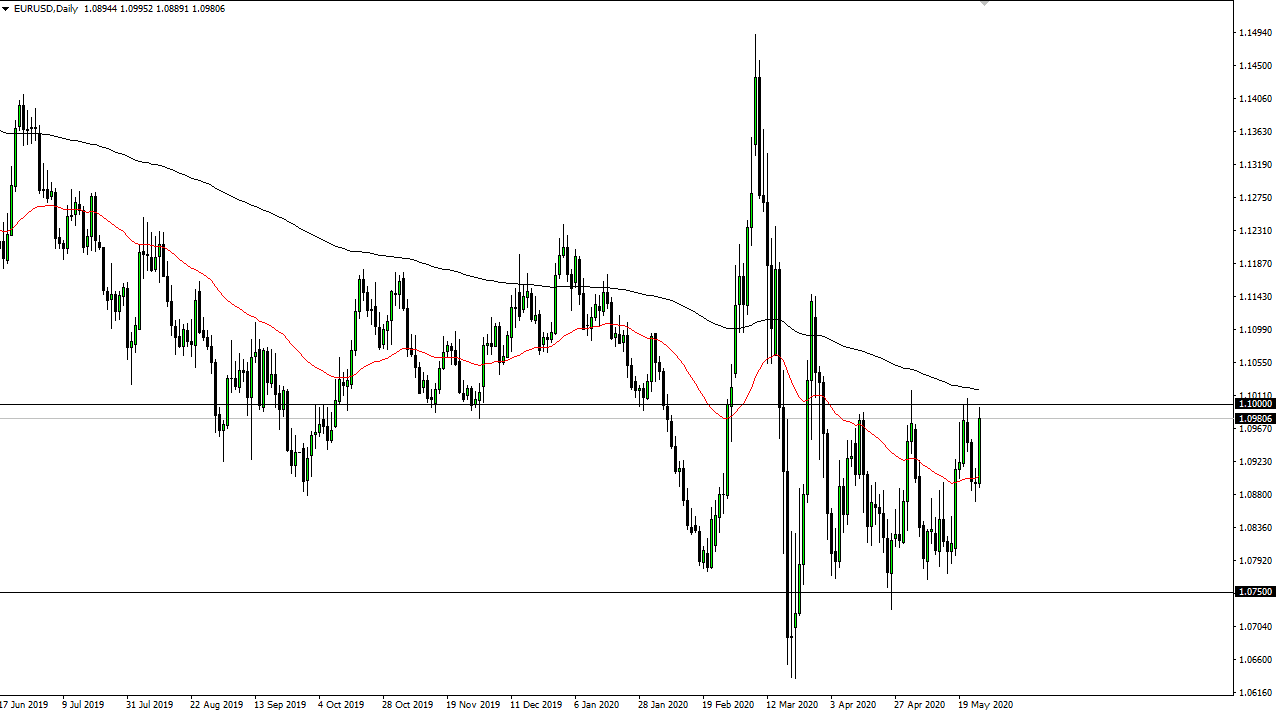 The 50 day EMA looks to be offering short-term support, down at the Monday candlestick, just as the 200 day EMA looks to be significant resistance above, sitting just above the 1.10 level. It will be interesting to see how this plays out, because the European Central Bank continues to work against the value of the Euro, loosening monetary policy but at the same time the Federal Reserve is doing very much the same thing at this point. Because of this, this is a market that should continue to be choppy and noisy. That of course is the norm when it comes to this pair, as we continue to see high-frequency traders push this thing back and forth.