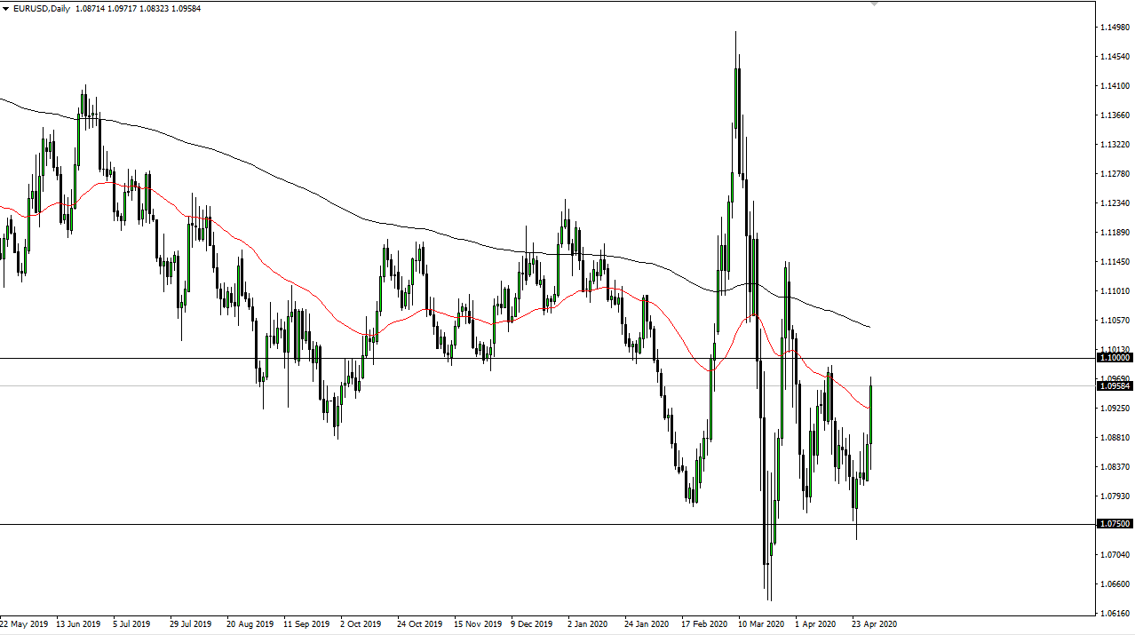 The Euro rallied significantly during the trading session on Thursday, reaching towards the 1.10 level as Christine Largarde did not give the markets the monetary methadone that they desperately needed during the press conference after the interest rate decision. While they did make borrowing for European banks realize negative rates, the reality is that it was not enough to impress the market. In fact, the Euro took off to the upside after that due to the fact that the Federal Reserve seems to be much more proactive when it comes to liquefy the markets, thereby putting serious pressure on the US dollar.