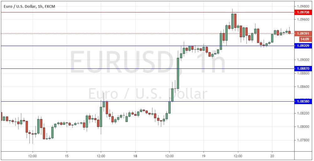 I wrote yesterday that we seemed to be set for more bullish price movement as the price was now trading firmly above the new higher support level at 1.0923. I was ready to take a long trade from a bullish bounce following a retracement to 1.0923, or a short trade from a strong bearish reversal at 1.1056.