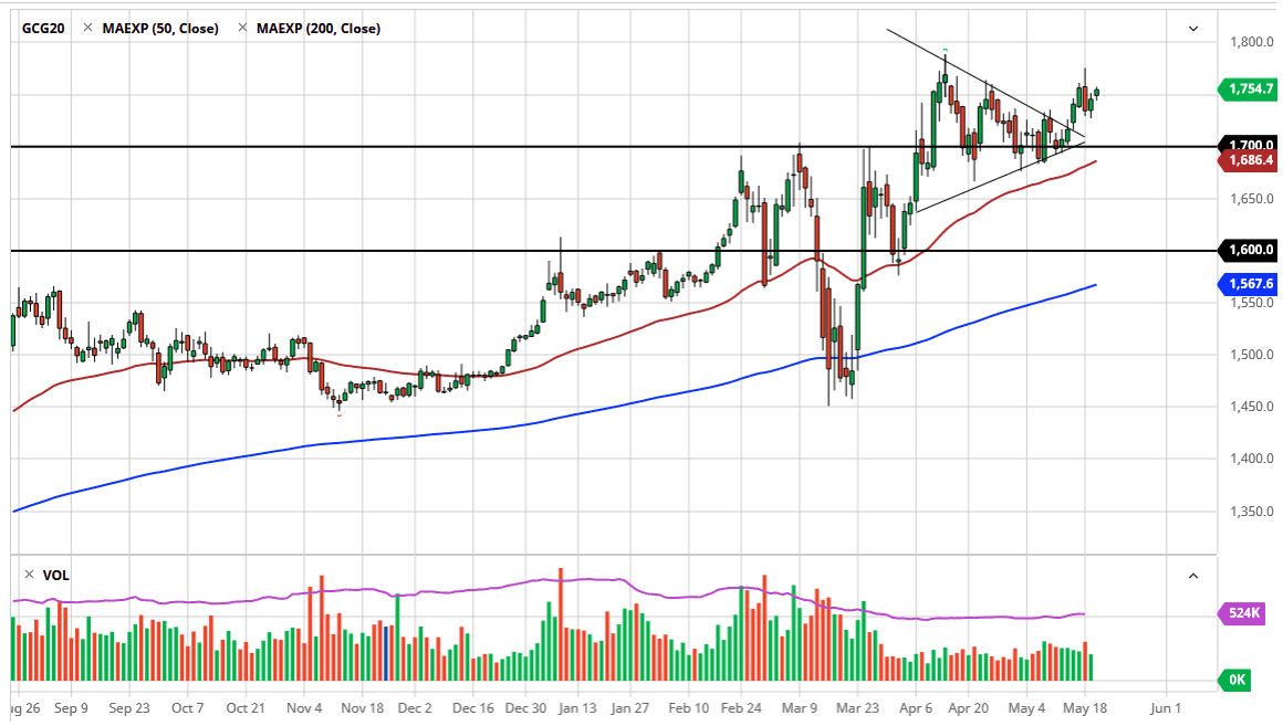 The US dollar of course has a major influence on this market as well, as it is priced in those very same US dollars. Ultimately, this is a market that is bullish but also has a lot of different things moving for and against it. This market will continue to be difficult to trade from short-term standpoint, but this is a market that I think you should be looking for value in the sense of short-term pullbacks offering “cheap gold.” After all, the very essence of trading is finding an asset that is cheap and then buying it. That is going to be no different in gold than it is any other market. Because of this, it simply is a matter of time before you can buy gold again on the day. However, if we did break out above that previously mentioned $1775 level, I would probably start to add to a core position there as well. I have no interest whatsoever in shorting gold, because it would require not only a major “risk on” type scenario but it would also require central banks to start loosening monetary policy, something that is not going to happen very soon, perhaps not even for decades with the amount of debt issues there are. Gold is just getting started.