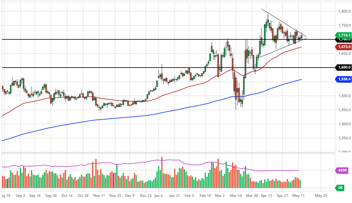 Even if we were to break down from here, the market could very well find itself testing the 50 day EMA where there should be plenty of support as well. At this point in time, I like the idea of buying gold due to the fact that central banks around the world continue to print money and of course we have to worry about whether or not economies ever open back up. The market participants continue to see a lot of reasons for this market go higher but now is the time that we will make some type of longer-term decision. The fact that $1700 has been so “sticky” is worth paying attention to, and therefore we will need to pay attention to the level, and the fact that the buyers continue to pick up value down at it. All things being equal, believe that gold will eventually go looking towards the $2000 level but it is going to take quite a while to get there. I have no interest in shorting this market.