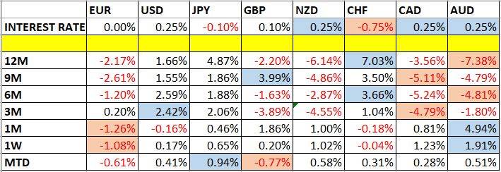 Let’s look at the relevant data of currency price changes and interest rates to date, which we compiled using a trade-weighted index of the major global currencies: