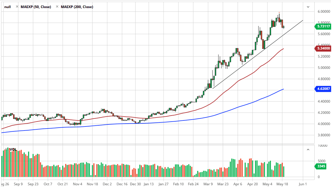 When I look around at the Russian ruble, the Indian rupee, the South African Rand, and of course the Brazilian real, it is obvious to me that emerging market economy still are in a lot of trouble, as shown in the FX markets. Furthermore, the debt around the world for these countries are quite often denominated in US dollars so it is going to cause a natural demand for the greenback anyway. The Brazilian real is considered to be a “gateway currency”, at least for South America. If you are trading on a South American thesis, this is the first place you look, perhaps followed by the Colombian peso. With that being the case, it is obvious that the world is very bearish on South America right now, and as a result it looks like we are going to go looking towards the 6.00 level again in this pair. I think short-term pullback should see plenty of support near the 5.6 level and offer value. Furthermore, the 50 day EMA is currently at the 5.34 level and rising quite rapidly and in a steady manner. Looking at this chart, there is no reason to think that we will continue to go higher over the next several weeks.