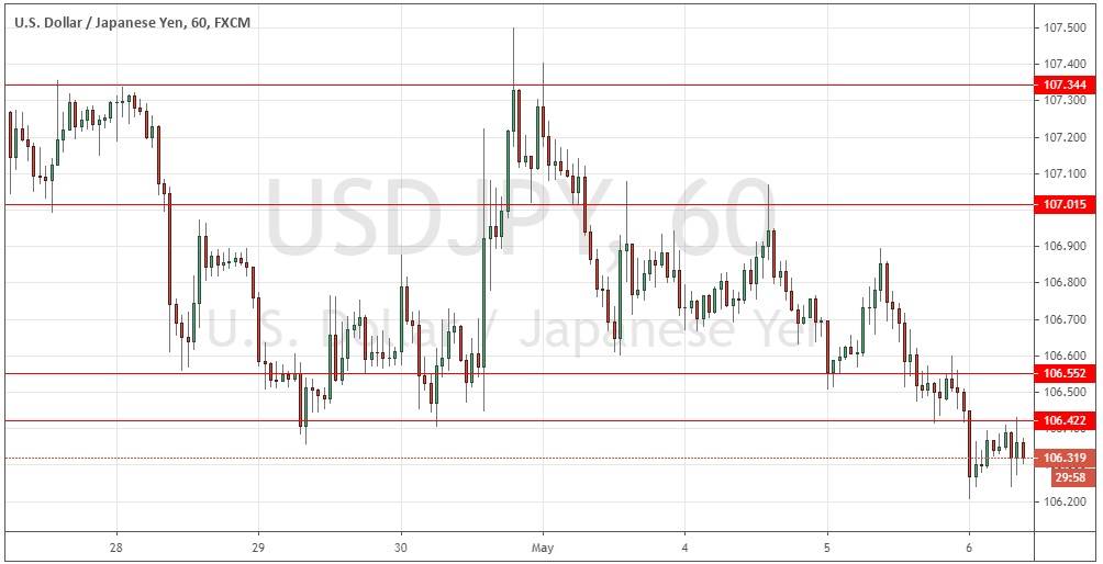 I wrote yesterday that this pair was hard to predict between 107.02 and 106.40, but I was prepared to take a short if we had gotten another strong failure following a retest of 107.02. This level was never reached. However, the price has acted bearishly, falling to new 6-week low prices, printing new lower resistance levels on the way down below 107.02, and invalidating the beginning of the bullish head & shoulders technical pattern we were seeing form between 106.40 and 106.60. These developments all point to lower prices being reached soon, so I take a bearish bias on this currency pair today as long as the price is below the lowest resistance level identified at 106.42.