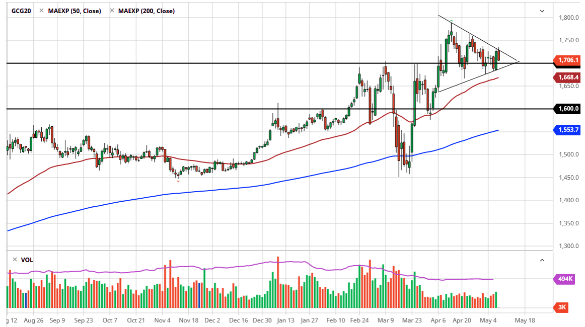 The first reason of course is the fact that the central banks around the world continue to flood the markets with liquidity, and therefore hard money will be something that a lot of traders look towards. The natural trade is to buy gold, and that is part of what has been driving this. Furthermore, you can see that the triangle forming is a bit of digestion for the biggest move to the upside. After that, you can also make the argument that we are simply waiting for further bad news, which will more than likely drive the safety trade forward, sending this market much higher.