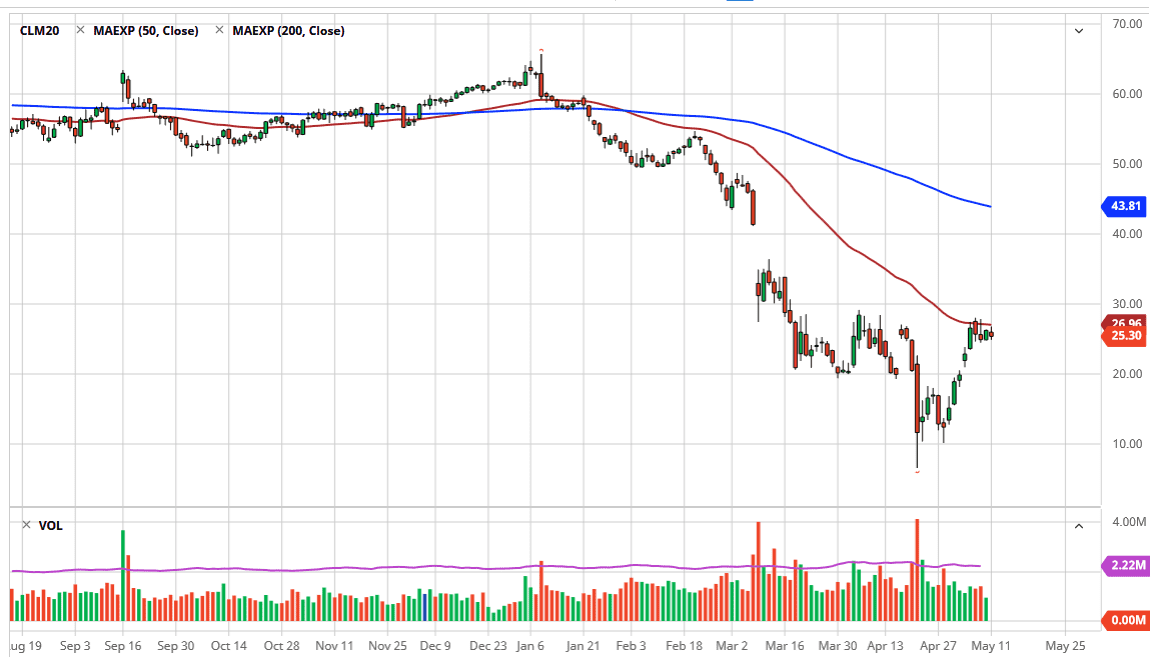 To the upside, the market was to break out above the $30 level, it would be a very bullish sign and could send this market much higher, perhaps sending it to the $35 level initially, before trying to fill the gap above at the $42 level. It is a bit difficult to imagine a scenario in which this happens, but it is one of the charts tell me. That being said, I am much more control fading rallies and of course breaking to the short side underneath the $25 level.