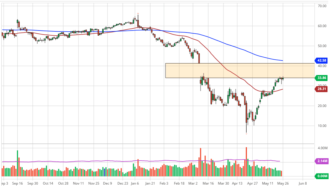 The West Texas Intermediate Crude Oil market continues to see a lot of resistance near the $34 level as it is the beginning of the gap higher. The gap extends all the way to the $41 level so now it comes down to whether or not we can break higher and continue to go towards that level. Ultimately, this is a market that is going to pay attention to a lot of foam well, which seems to be the main driver.