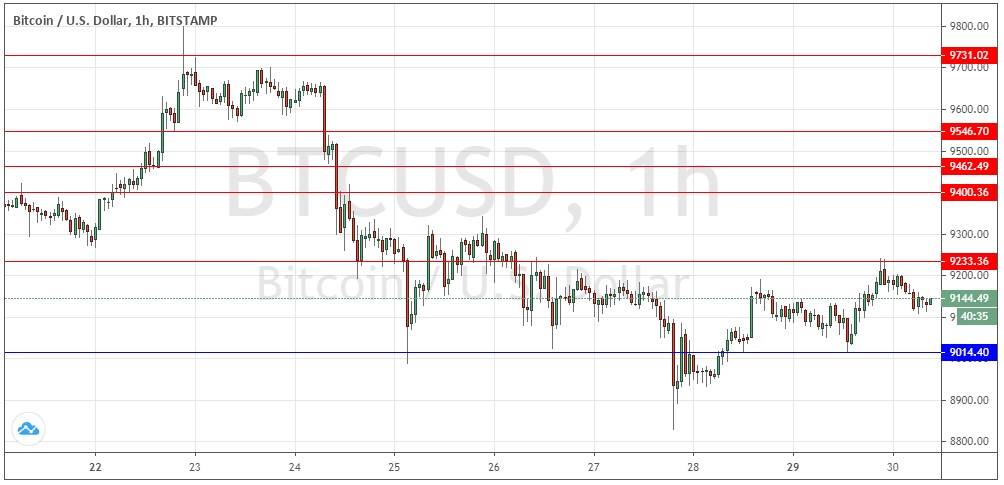 • Go short after a bearish price action reversal on the H1 time frame following the next touch of $9,233, $9,400, or $9,462.