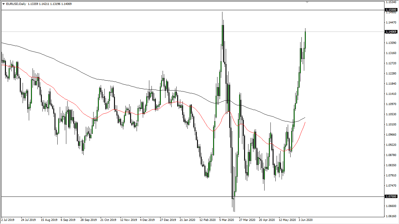 I do not necessarily think that you can short this market, but it certainly looks as if it is going to struggle to continue the parabolic run that we have seen. The last couple of days have been a little bit in the way of consolidation, so I think that there is support running down towards the 1.13 level. Ultimately, this is a market that I think continues to see a lot of noise, mainly because there are so many questions out there when it comes to where the economy is going. I do not like buying all the way up here anyway, so having said that it is likely that the pullback in the short term will find a certain amount of value hunters, but if we give way below the 1.13 handle, it is likely that we could drop even further, perhaps reaching towards the 200 day EMA. We have seen these parabolic moves before, and they typically at the very least need some type of pullback.