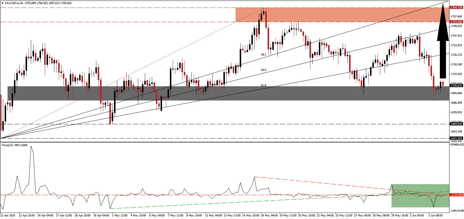 In the event the Force Index is pressured into a reversal by its descending resistance level, gold is likely to attempt an extension of its corrective phase. Given the disconnect between financial markets and fundamentals, in conjunction with an increase in risk for a secondary Covid-19 infection wave, any breakdown from current levels will offer traders an excellent buying opportunity. The downside potential is limited to its support zone located between 1,657.42 and 1,669.05.