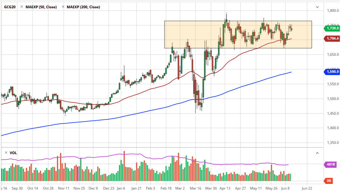 The gold market initially tried to rally during the trading session on Friday but found the $1750 level to be resistant, which I think extends all the way to the $1775 level. Pulling back from here makes sense, considering that we have been consolidating for quite some time, we were reaching into the weekend. The gold trade has been a bit quiet, which is truly interesting considering that with the way the stock markets are acting, you would assume that it would be a major “risk off” type of scenario, which should be bad for gold, but you can see we are still hanging out in the same area.