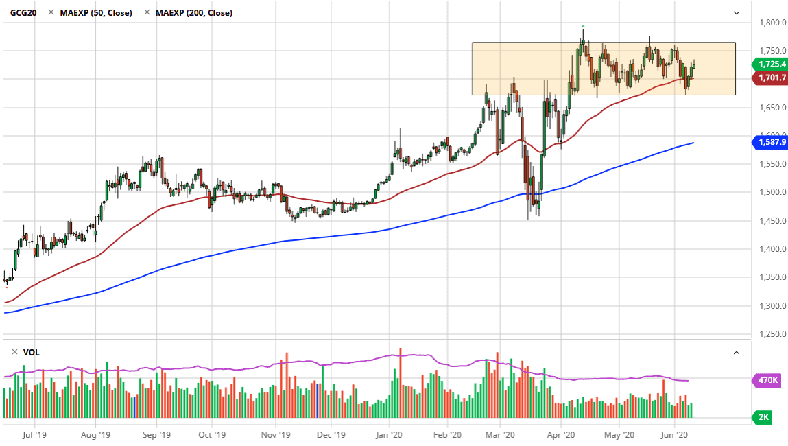 Another thing to look at is the fact that we are consolidating in a huge rectangle, which quite often “consolidation leads to continuation”, as the saying goes. That typically means that will consolidate like this, and eventually break out in favor of the previous trend, which in this case was most decidedly to the upside. I can give you 100 reasons why gold might rally in the short term and cannot think of many as to why it would not. With that in mind, I think that buying dips continues to work, at least until we break out for a longer-term move. If we did somehow break down below the bottom of the rectangle, then I think there is massive support down at the $1600 level, which has the 200 day EMA sitting just below it. In that area, it would be more or less saving the trend, so I think there would be a lot more effort by the bulls to push this thing higher. If the US dollar continues to get hammered, I think that will be fairly good for gold as it typically is, but we also have plenty of potential economic shocks out there just waiting to happen, which could also lift gold.