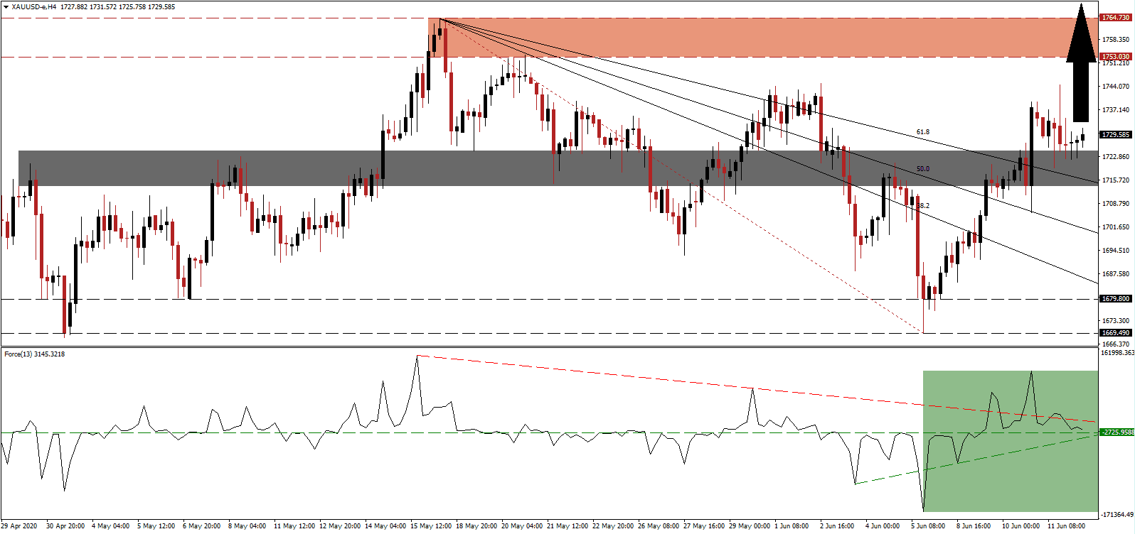 According to the latest World Bank assessment, the global economy will not return to levels preceding the Covid-19 pandemic until 2022, and only if certain developments materialize. The current trend points in the opposite direction, with new infections on the rise globally after many governments eased or lifted lockdown restrictions. It adds a long-term bullish catalyst for this precious metal. Increasing upside pressures in gold was the push above the descending 61.8 Fibonacci Retracement Fan Resistance Level. It accompanied the conversion of its short-term resistance zone, located between 1,713.98 and 1,724.70, as marked by the grey rectangle, into support.