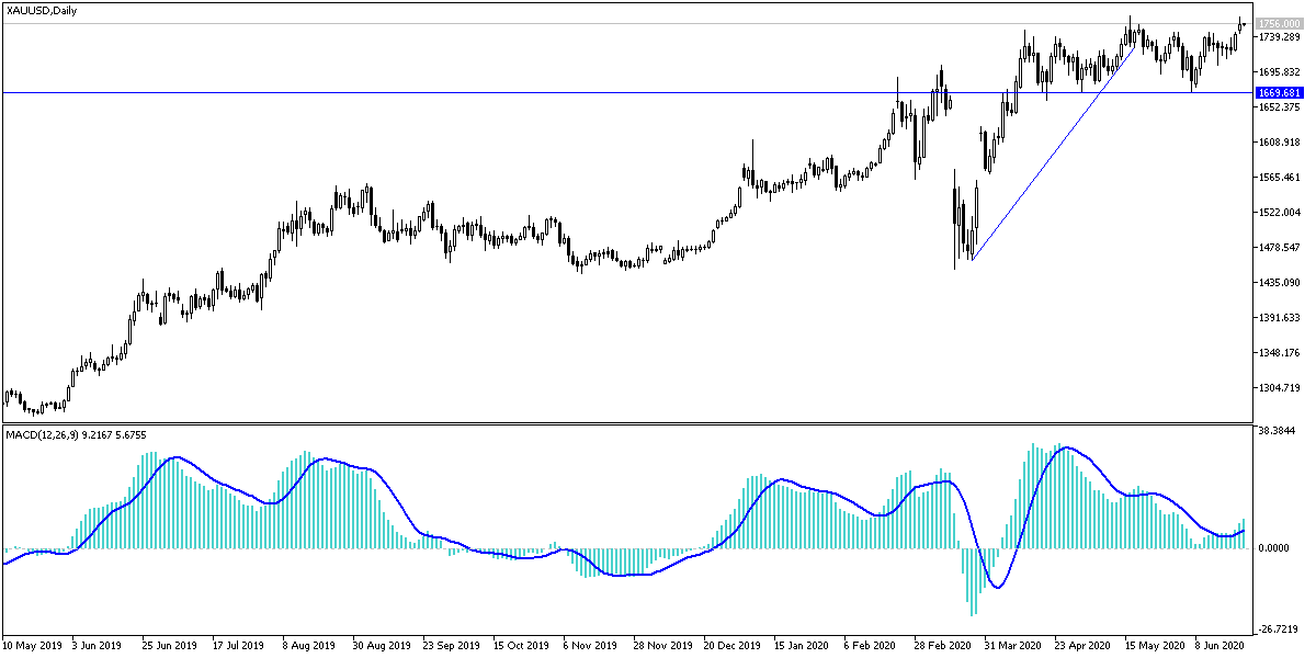 With the beginning of this week’s trading, gold prices rose to achieve sharp gains that pushed it to the resistance at $1763 an ounce, the highest level since mid-April, with the rise of new COVID-19 cases. The yellow metal settled around the $1754 dollars an ounce in the beginning of Tuesday’s trading. Escaping the risk, with renewed fears of increasing global infection numbers, increased demand for the metal as a safe haven.