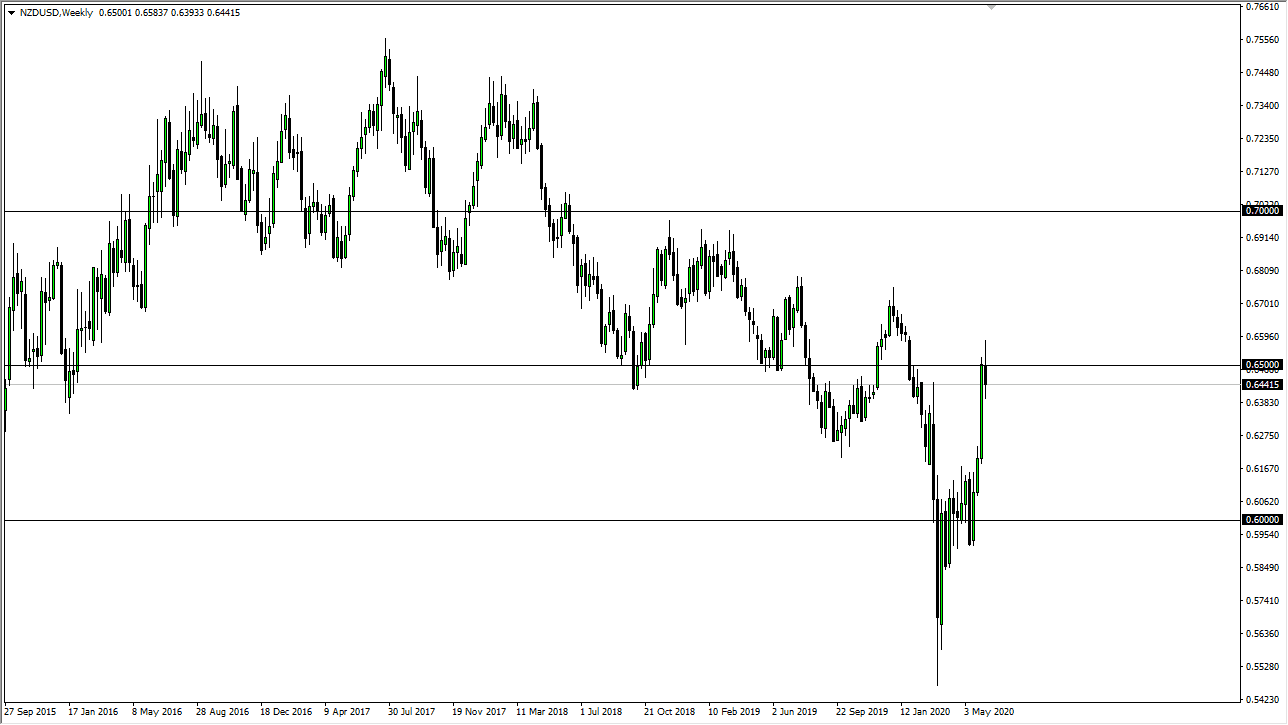 The New Zealand dollar initially tried to rally during the week but found a lot of selling pressure above the 0.65 handle. This is a market that I think continues to find sellers in that region and if we break down below the bottom of the weekly candlestick, somewhere near the 0.6390 level, the market will then break down moving towards the 0.62 handle. On the other hand, if we break above the high of the week, which is basically the 0.66 handle, then the market will move towards the 0.68 level above.