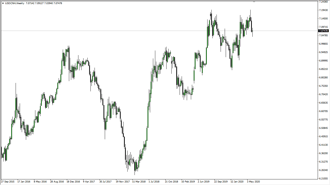 The US dollar broke down significantly during the trading week but then turned around to show signs of life at the 1.05 handle. By forming a hammer, it suggests that the United States dollar will rally a bit, perhaps reaching towards the 7.15 level. This is a sign of “risk off”, if it does in fact happen, and you should be watching this pair. It is a bit difficult to trade at times because the market is not as free-flowing as many other currencies, but it is worth paying attention to in order to trade other pairs.