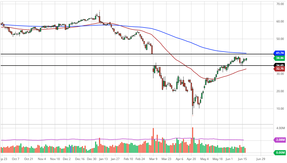 Regardless, the reality is that a lot of traders believe that the gap gets filled, so in a sense, it becomes a bit of a self-fulfilling prophecy. If that is going to be the case, then the $41 level will be tagged. The 200 day EMA is sitting just above so that is an obvious resistance barrier anyway, so at this point in time it is very unlikely that we do not make it, but it is just as likely that we do not break out either. I think short-term buying still makes quite a bit of sense, as we try to figure out what the overall range will be next. The downside has not really been figured out yet, but I think it is only a matter of time before the market tries to find out where that is. Currently, my best guess is that it would be between the $40 level on the top and the $30 level on the bottom. We do not really know that yet, but the smart money is betting on the $40 level reaching towards the $41 level as a barrier.