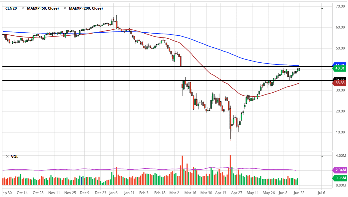 The West Texas Intermediate Crude Oil market initially gapped lower to kick off the trading session on Monday, but as you can see we continue to reach towards the $41 level above, which is worth paying attention to as it is the top of the gap that we had been forming for quite some time. Ultimately, I think this market will run into a lot of trouble in that area, as the 200 day EMA is sitting just above there course offers a bit of a brick wall as well.