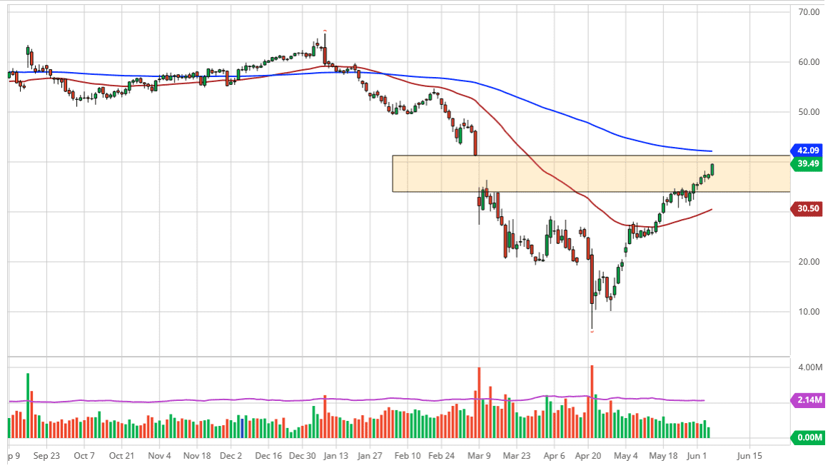 To the downside, the $35 level would be an area that traders will be looking towards, if we do of course break down significantly from here. As even if we break below the $35 level it is likely that the market will then move towards the 50 day EMA.