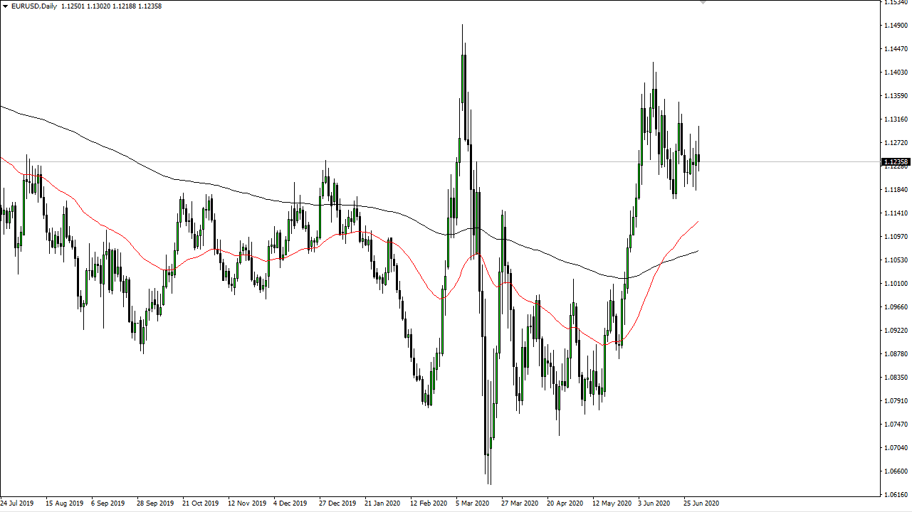 To the downside, the market could go towards the 1.10 level, maybe even the 1.1050 level as it is where the 200 day EMA currently sits. Recently, we have seen the Euro just grind lower more than anything else. Some people think this is a bullish flag, but I do not believe that is what we are looking at due to the angle of the drop. This just simply a sloppy and messy currency pair that cannot quite figure out what to do with itself. After all, the Federal Reserve is trying to kill the US dollar, but at the same time the European Central Bank continues to be a major issue. After all, they are buying anything that is not nailed to the floor, so it is not difficult to imagine a scenario where we simply chop back and forth.