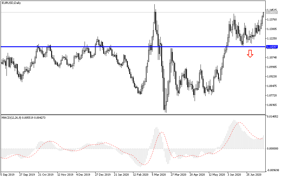 For the four trading sessions in a row, the EUR/USD is in the range of an upward correction that pushed towards the 1.1423 resistance in early trading today. This is its highest level in four months, before settling around 1.1395 at the time of writing. The pair's gains came in conjunction with rising tensions between the United States and China, and after German Chancellor Angela Merkel drew a line in the sand over negotiations regarding the European Recovery Fund before the European Union Council meeting on Thursday, which is the most important event this week and the most influential on the single European currency.