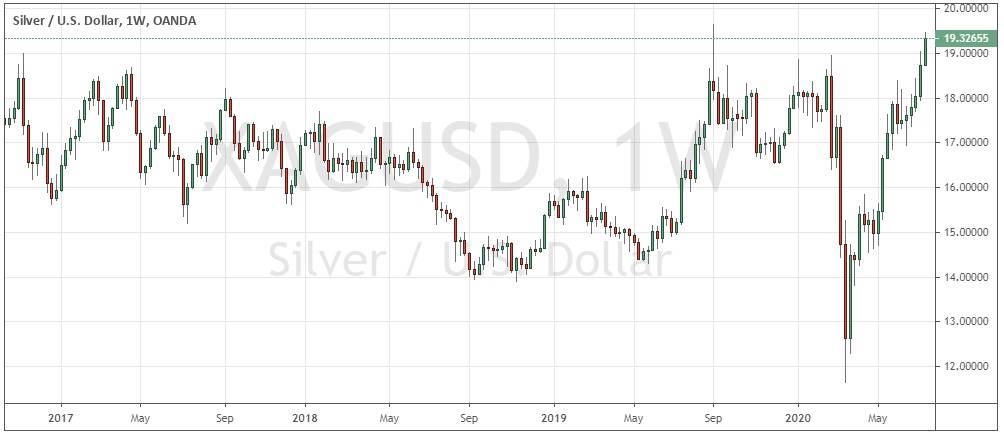 Last week printed a bullish candlestick which closed at a new 3-year high weekly closing price. The price also closed near the high of the weekly range. These are bullish signs and other precious metals such as Gold are also advancing against the U.S. Dollar. There is a good chance that the price of Silver will rise over the coming week.