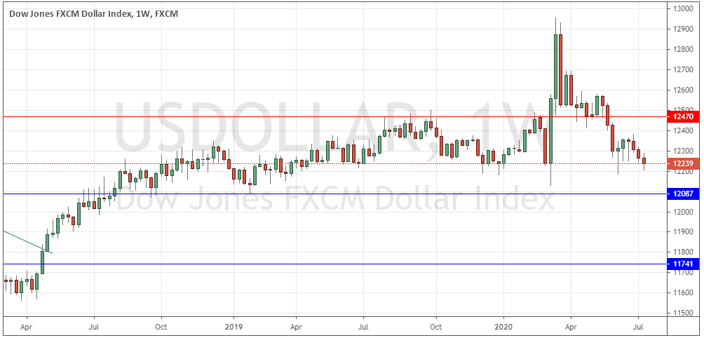 The weekly price chart below shows last week printed another relatively small bearish candlestick which followed another bearish candlestick last week. This short-term price action is unquestionably bearish. There is finally a long-term bearish trend, as the price is lower than it was both 3 and 6 months ago. The problem for bears is that the price is now close to the 12200 area which has provided support since early 2019, so a break below 12087 would be a significantly bearish technical development if it happens. Overall, next week’s price movement in the U.S. Dollar looks slightly more likely to be downwards than upwards based upon the recent price action.