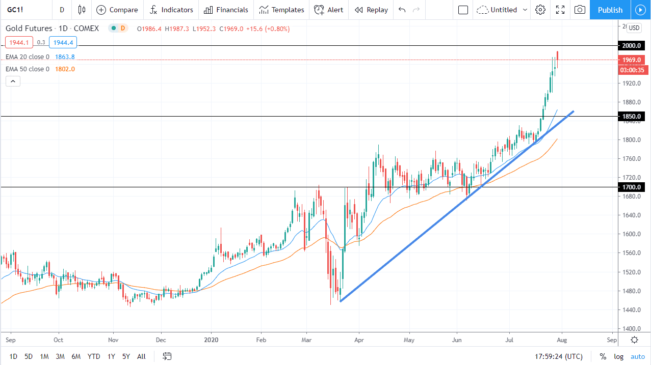 This is all about the US dollar and how it is behaving, so pay attention to the US Dollar Index. If the US dollar index continues to weaken, then it should continue to drive gold higher and of course vice versa. Ultimately, this is a market that is tracking the Federal Reserve and its plans. Nonetheless, even though we all know that the monetary policy is going to continue to see a lot of stimulus, so that of course will push this market higher. If and when we can get some type of close above the $2000 level, it is likely that we could continue to go higher but I really hope that we at the very least kill some time before breaking out. A pullback of course is preferable, because like anything else you want to be able to buy it when it is “on sale.”