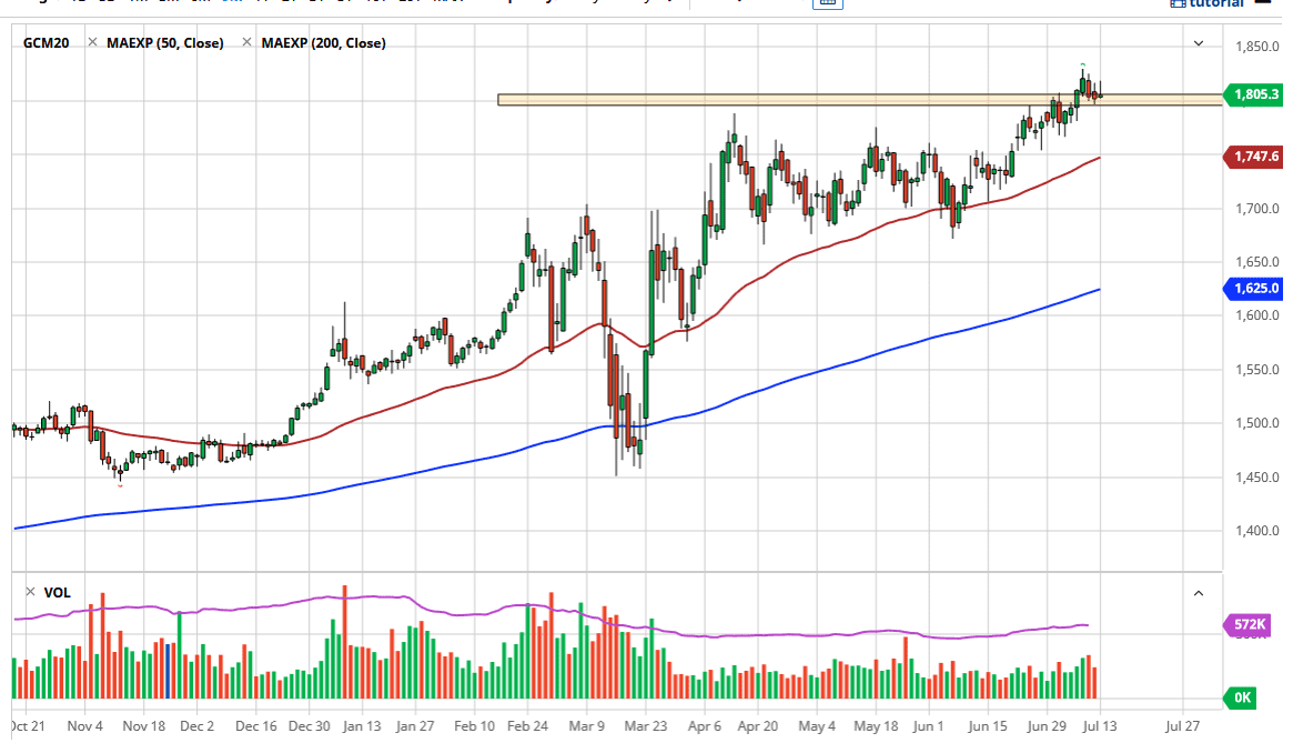The gold market initially tried to rally during the trading session on Monday but found quite a bit of resistance above as we sold off late in the day. California is starting to shut down a lot of things again, which suggests that perhaps the United States may go back as far as the coronavirus is concerned. That said people are running towards the US Treasury market, which demands US dollars. Furthermore, people will have to sell winners sometimes to take care of losers in the stock market, something that gold has suffered at the hands of more than once.