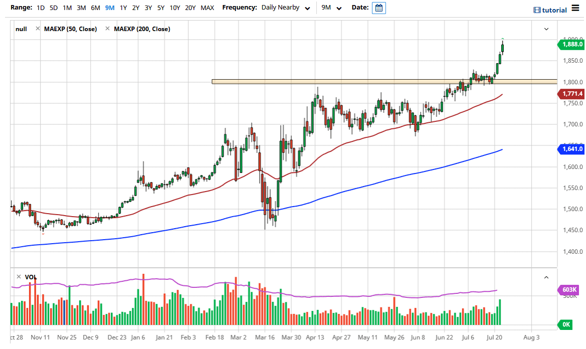 Ultimately, this is a market that I think will continue to gain due to the fact that the Federal Reserve is working so hard against the value of the US dollar, via quantitative easing. The dollar is historically expensive against many other currencies, so I think that this goes on for quite some time, especially as the US Dollar Index has broken down through support during the day. That should continue to boost gold, but quite frankly I think there is an argument to be made for the short-term pullback that offers a bit of value that you should be looking at. Furthermore, the traders that had been short of the gold market at the $1800 region will desperately want to get out of the market close to the breakeven point, and that would more than likely cost support as well. For those out there that missed this move, they would love to see this pullback so they can get involved as well. Clearly, we have broken out and look likely to go higher.