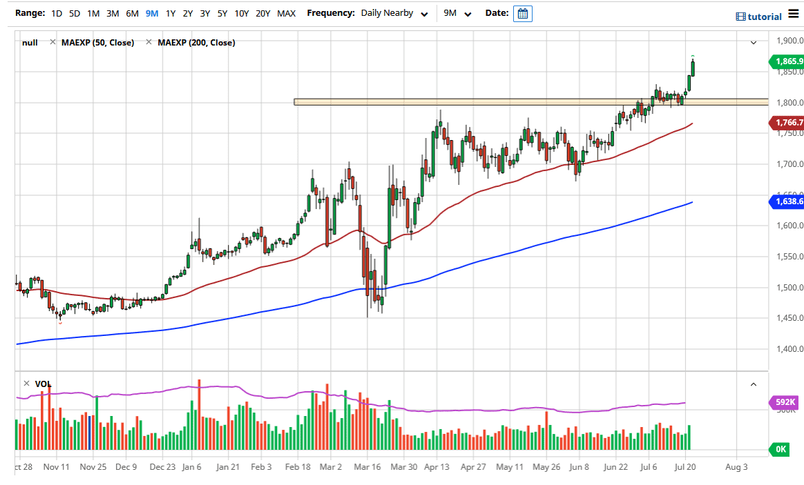 Gold markets have rallied during the trading session on Wednesday as we have broken above the $1850 level. At this point, the market is likely to see a lot of buyers on dips, as we have most certainly broken out. The US dollar has been getting pummeled, so that has made gold attractive for most traders, as we have been in a longer-term uptrend. To the downside, the $1800 level was significant resistance, and now it should be significant support. Beyond that, it is also a psychologically important figure so a lot of traders will be paying attention to it. Furthermore, the 50 day EMA sits below the $1800 level and will offer a significant amount of support as well, perhaps even offer a defining marker for the trend.