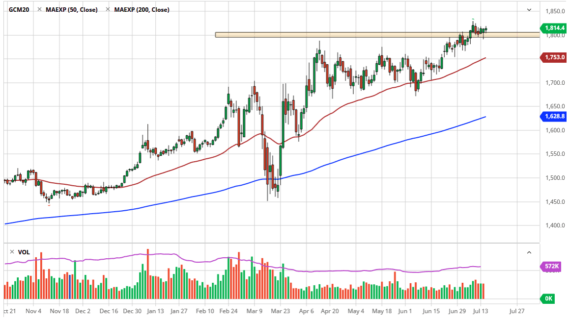 Gold markets have rallied a bit during the trading session in the end, but it was a difficult day all around. We gapped higher ever so slightly at the open, shot up in the air, broke back down towards the $1805 level, turned around to show buying pressure again only to form a very neutral candlestick. This tells me that the market is still moving on the latest headline, which means the coronavirus. All things being equal, I do think that this is a market that has a plethora of fundamental reasons to go higher, so I do not have any interest in shorting gold.