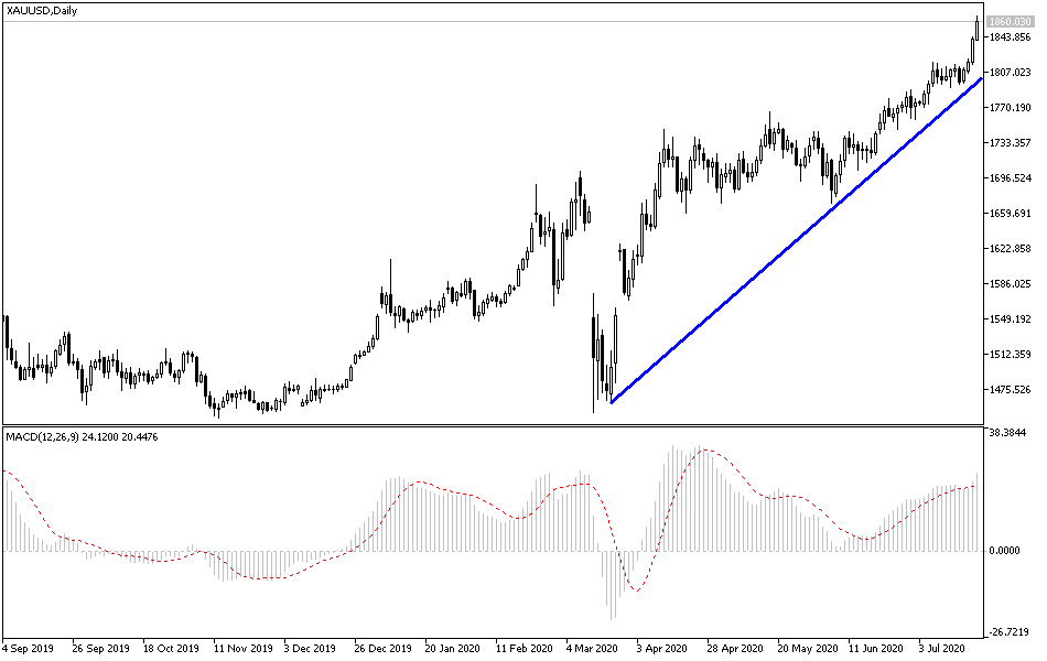 Gold prices rose sharply and gold futures settled at their highest level in almost 9 years, supported by the European Union's announcement of a Eurozone recovery fund, and optimism about the new stimulus in the United States. The sharp decline in the US dollar also contributed to the noticeable rise of the metal, pushing the price to $1866 an ounce, and settling around the $1857 at the time of writing. In the same performance, September silver futures rose $1.365, or about 6.8%, to $21,557 an ounce, the highest contract settlement since March 2014. Meanwhile, copper futures settled in September at $2.9580 a pound. The gains in the metal markets came despite optimism in the markets, but the weakness of the US dollar was the strongest catalyst for achieving these record gains.