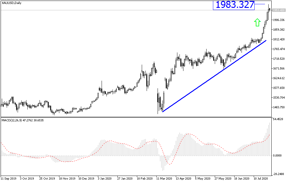 According to the technical analysis of gold: The general trend of the gold price is still bullish and strongly so, and the price does not care that technical indicators reached the overbought areas, as factors of its gains remain the strength of the COVID-19 virus in paralyzing the global economy, US/Chinese tensions, more stimulus to revive the US and global economy and a strong drop for the US dollar. The latest performance will support expectations of the opportunity for the price of gold to reach the next psychological resistance at $2000 an ounce. From there and above, we prefer selling in anticipation of a sharp profit-taking sell-offs. The first opportunity for bears to control performance may be if the price moves towards the support level at $1880.